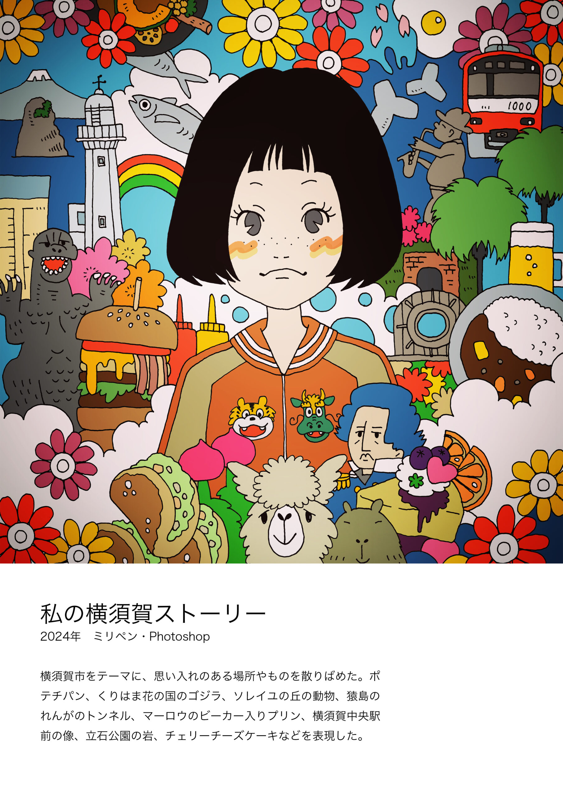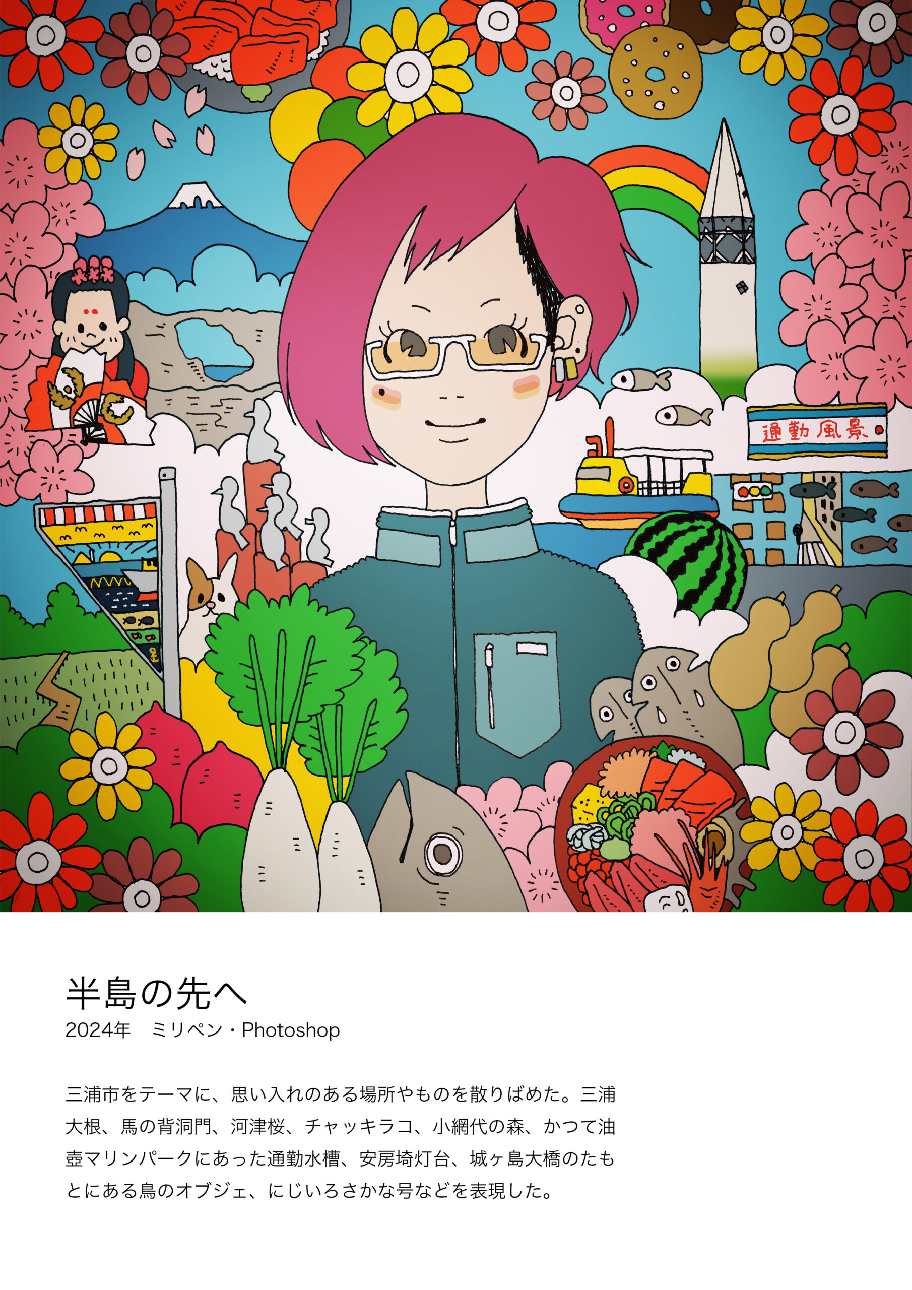 私は神奈川のローカル企業(県内各所に拠点がある地元新聞社)に新卒で就職してから約14年、記者の仕事で地元の人たちから文化や歴史について聴き、休日は地元に関する絵を描き、二足のわらじで地域と向き合ってきた。ライフワークは、県内地域を題材にしたご当地イラスト。中でも三浦半島は特に思い入れが強いエリアである(仕事で担当したことや壁画を描いたこともある)。今回、地域で初個展を開き、地域の人たちが語る「三浦半島」の記録を聞き取り、アートという形で残したいと思った。既存の作品を壁に並べるほか、来場者が思う三浦半島のモノやコトについてその場で聞き取り、イラストにして展示する「参加型パフォーマンス」を行う。難しい理念は掲げず、三浦半島の人たちに「やっぱり地元っていいね」「地元にも、まだまだ知らない魅力があるんだね」と感じてもらうことを目指す。作品制作にあたり制作協力者募集のお願い。