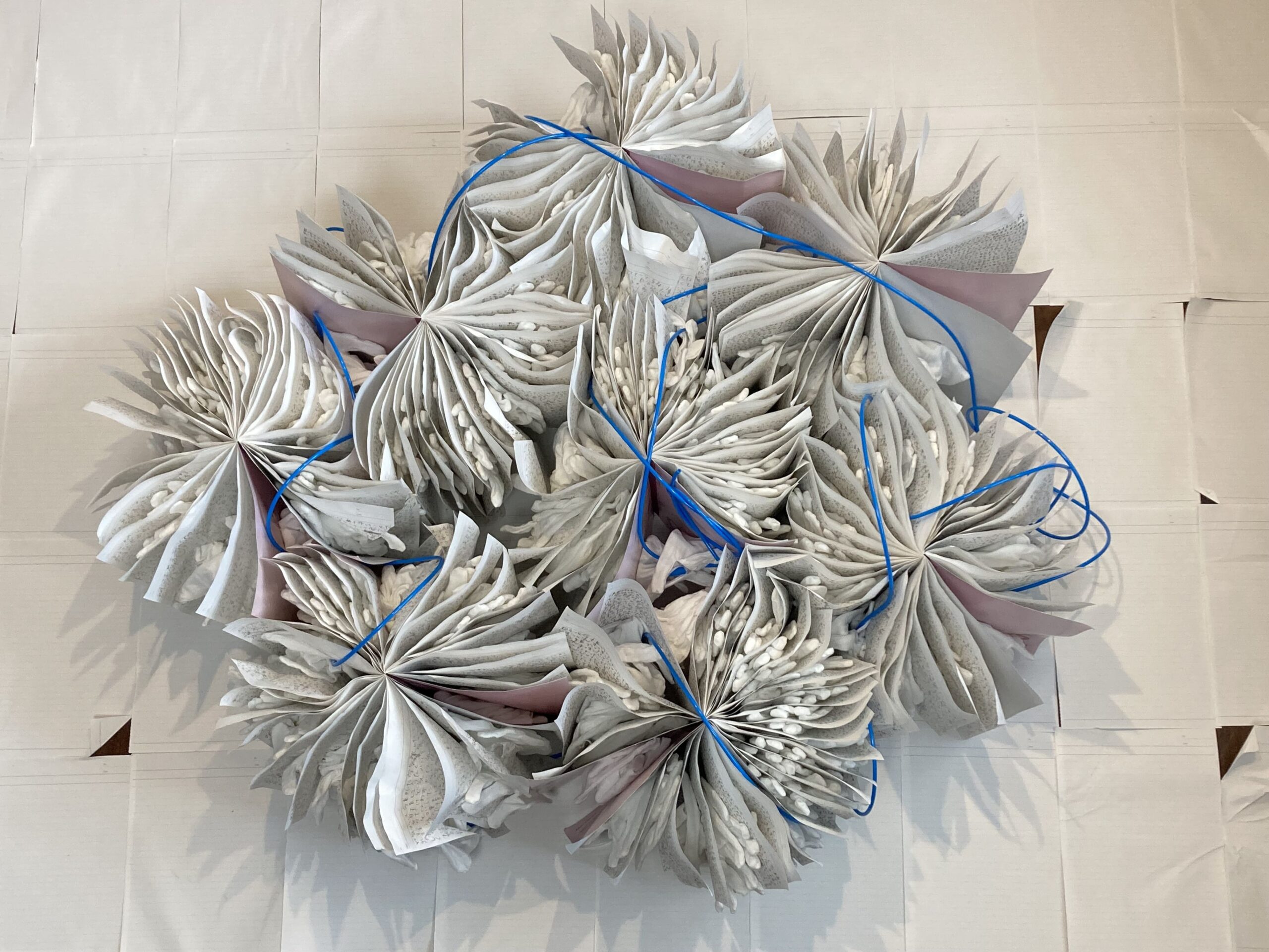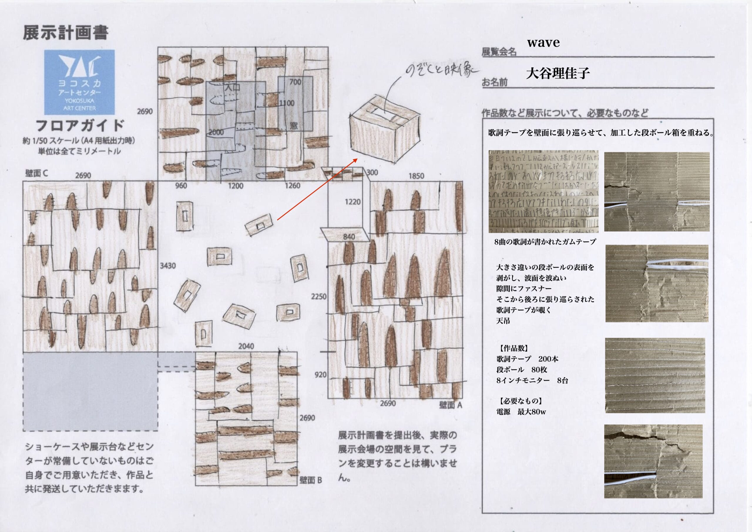 溢れる情報やモノたちが押し寄せる毎日。自分の大切を見失っていることさえ忘れているかもしれない。波間に覗く何かを掬い上げる心の余白を持っていたいと思う。日々消費される段ボールの波面は、生活の中にある波のようだと感じた。波面に糸で波縫いを施す。大きな広がりも小さな一目の幾多の重なりによるものだ。段ボールの身近な素材としてガムテープも用いる。ガムテープに歌詞を手書きする。言葉のうねりも波のように見える。段ボールの中を覗くと映像が見える。ガムテープに書かれた歌詞を歌った歌と共に、作品に用いられた素材を組み合わせた映像が展開する。それぞれが交錯しあって一つの空間の中で波を体感できる展覧会にしたい。